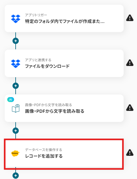 Dropboxでファイルがアップされたら、OCRでファイル内容を読み取りkintoneに追加するフローです。