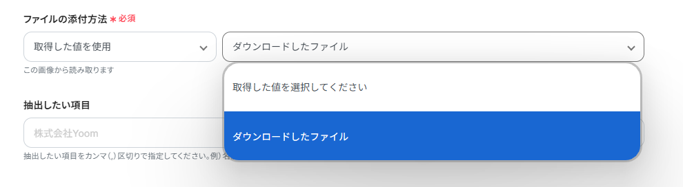 2.「ファイルの添付方法」は、読み取りたい画像を選択します。入力欄をクリックして表示されるプルダウンから選択してください。