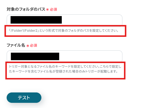 4.「対象のフォルダのパス」「ファイル名」は、入力欄下の説明に従って、入力してください。