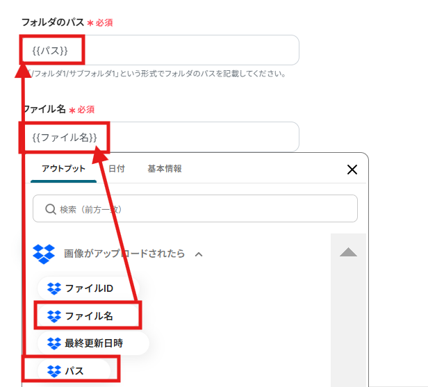 「フォルダのパス」「ファイル名」は、入力欄をクリックして表示されるアウトプットから選択してください。
