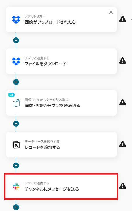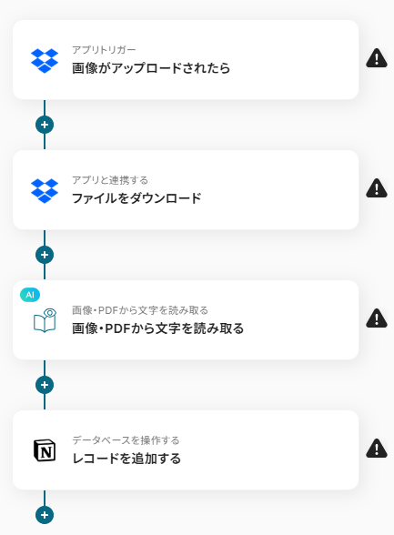 このフローでは、Dropboxに画像をアップロードするとYoomが自動でOCR処理を行い、抽出したテキストをNotionに追加することができます。さらに、Slackでチームに通知することで情報の共有がスムーズに行えます。この自動化により、手作業の手間を減らして業務効率を向上できるでしょう。