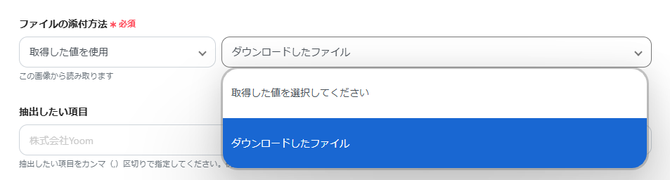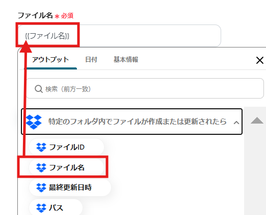 「ファイル名」は、入力欄をクリックして表示されるアウトプットから選択できます。