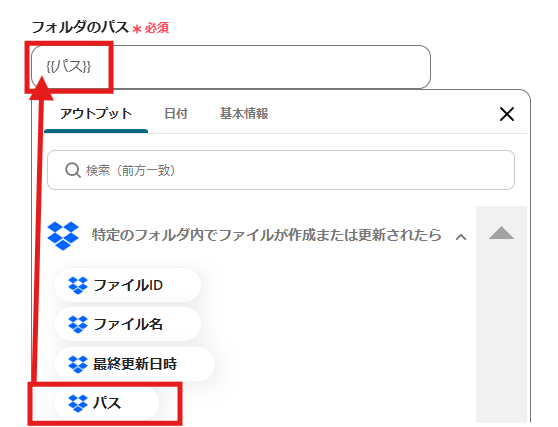 「フォルダのパス」は、入力欄をクリックして表示されるアウトプットから選択できます。