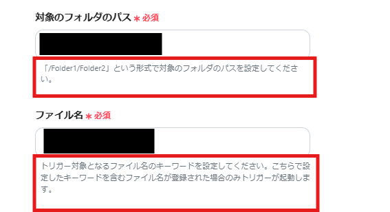 3.「対象のフォルダのパス」「ファイル名」は、入力欄下の説明に従って、入力してください。