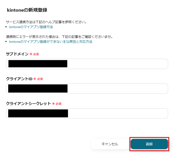 ※kintoneのマイアプリ登録がうまくいかない場合は、ヘルプページを参照してください。