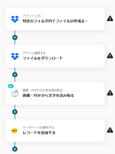 Dropboxでファイルがアップされたら、OCRでファイル内容を読み取りkintoneに追加するフローです。