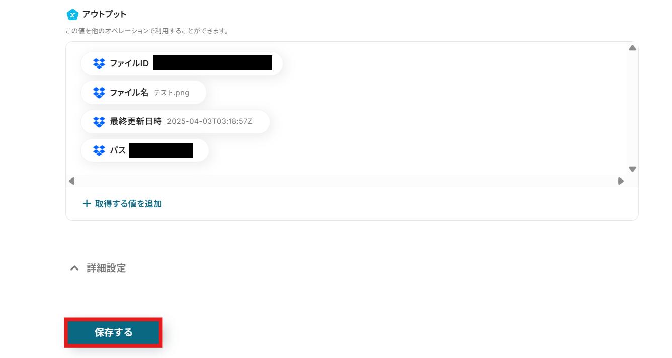 テストが成功すると、以下のようにDropboxから取得した情報がアウトプットとして表示されます。