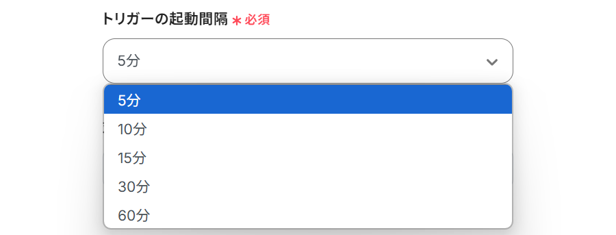 トリガーの起動間隔:5分、10分、15分、30分、60分の中から選べるようになっています。