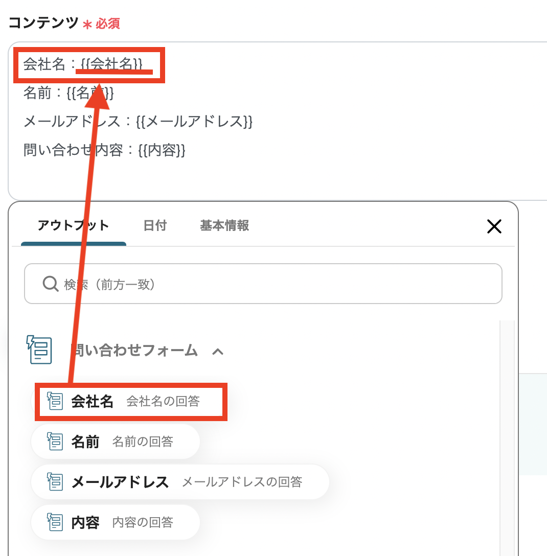 次に、Notionに入力する内容を「コンテンツ」に入力します。