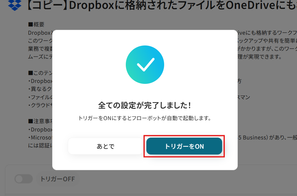 フロー画面に戻り、「全ての設定が完了しました!」と表示されていればフローの設定は完了です。 早速フローを稼働させるのであれば、「トリガーをON」をクリックします。
