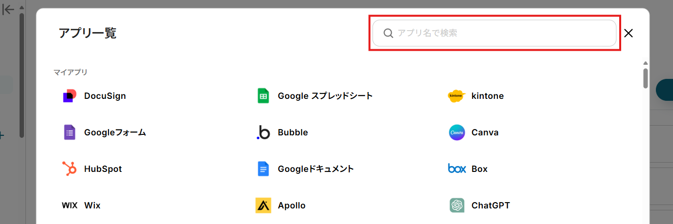 「アプリ一覧」が表示されたら、右上の検索バーでアプリ名を検索して選択。