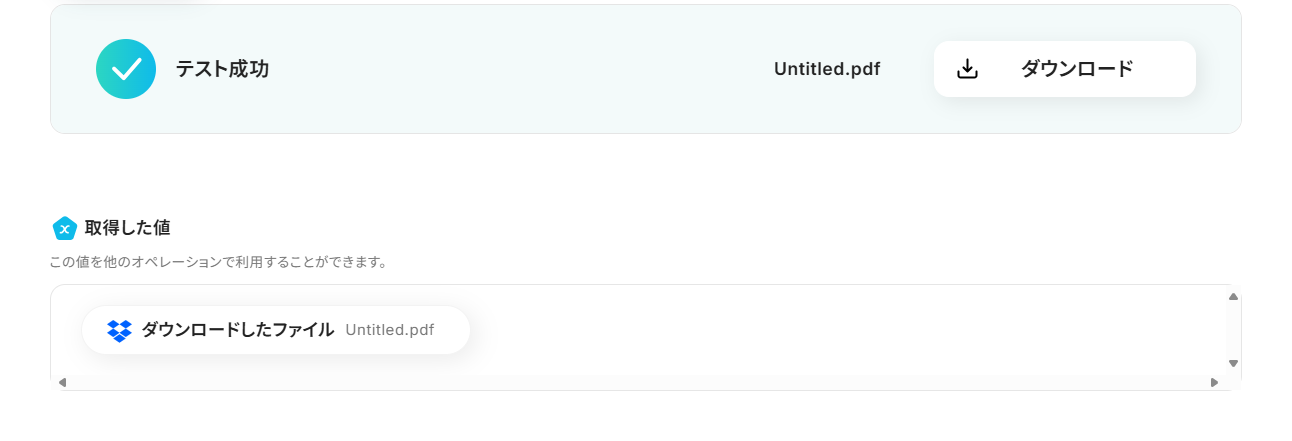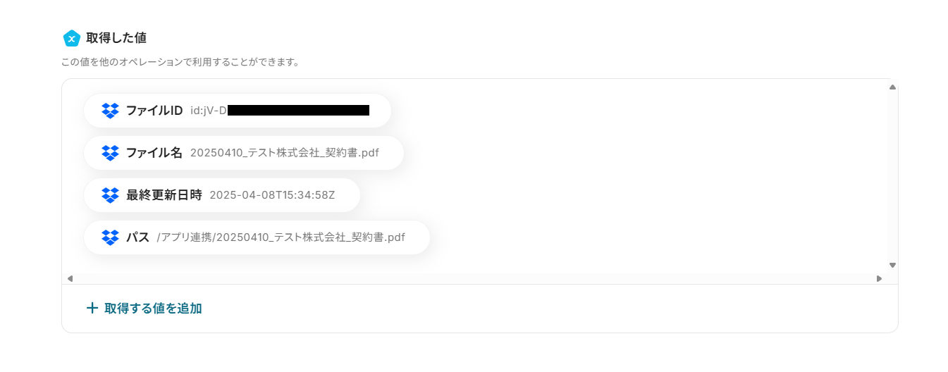 テストに成功すると、「取得した値」に取得したファイルの情報がアウトプット として表示されます。
