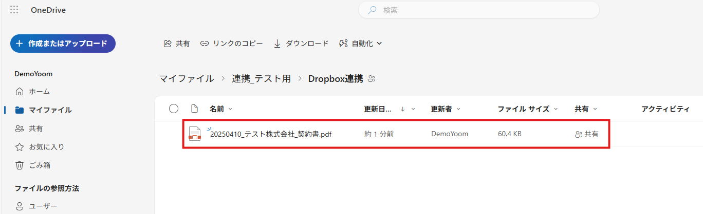 テストに成功したら、OneDriveの指定したフォルダにファイルがアップロードされていることを確認しましょう。