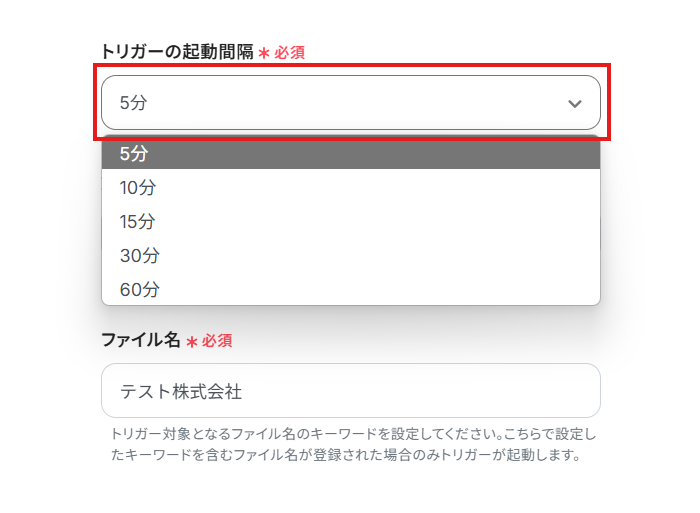 3.「トリガーの起動間隔」のプルダウンから任意の間隔を選択。 ※ トリガーの起動タイミングは、5分、10分、15分、30分、60分のいずれかで設定できます。 ご利用プランによって、設定できるトリガーの最短間隔が違うので、その点は要チェックです。 ※ なお、基本的にはそのプランの最短の起動間隔にしてお使いいただくことをおすすめします。