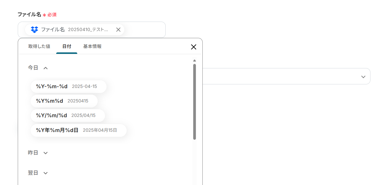 6.「ファイル名」にはデフォルトで、ステップ3で取得した値(ファイル名)が設定されていますので、必要に応じて変更してください。 各アクションで取得した値は、入力欄クリック時に表示される「取得した値」タブから選択可能で、「日付」タブから任意の日付を追加することもできます。