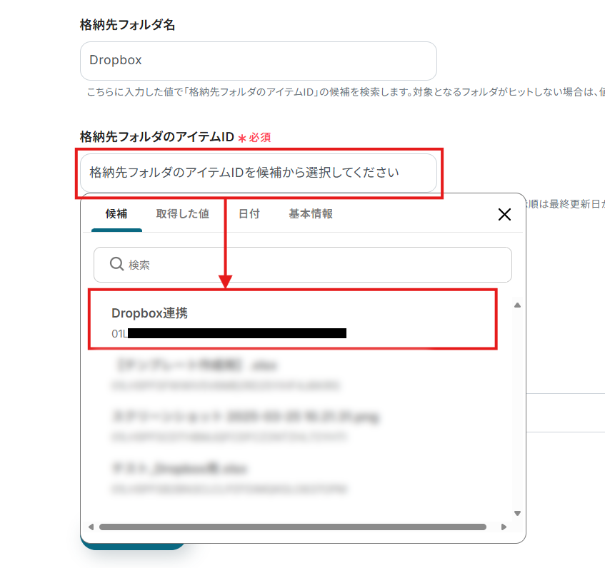5.「格納先フォルダのアイテムID」のプルダウンに、ドライブIDに紐づくフォルダID一覧が表示されます。 「格納先フォルダ名」に入力した値を含むフォルダが上位に表示されるため、対象となるフォルダを選択してください。