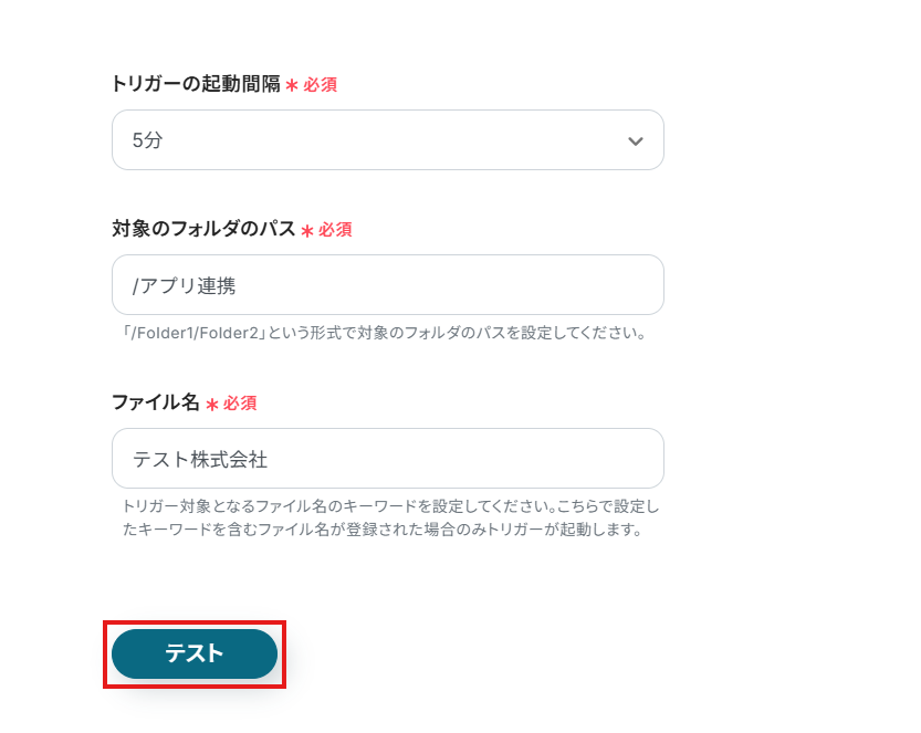 6.設定を終えたら、「テスト」をクリック。 ※ 直近1時間以内に「ファイル名」に設定したキーワードを含むファイルが作成または更新されていない場合はテストに失敗します。