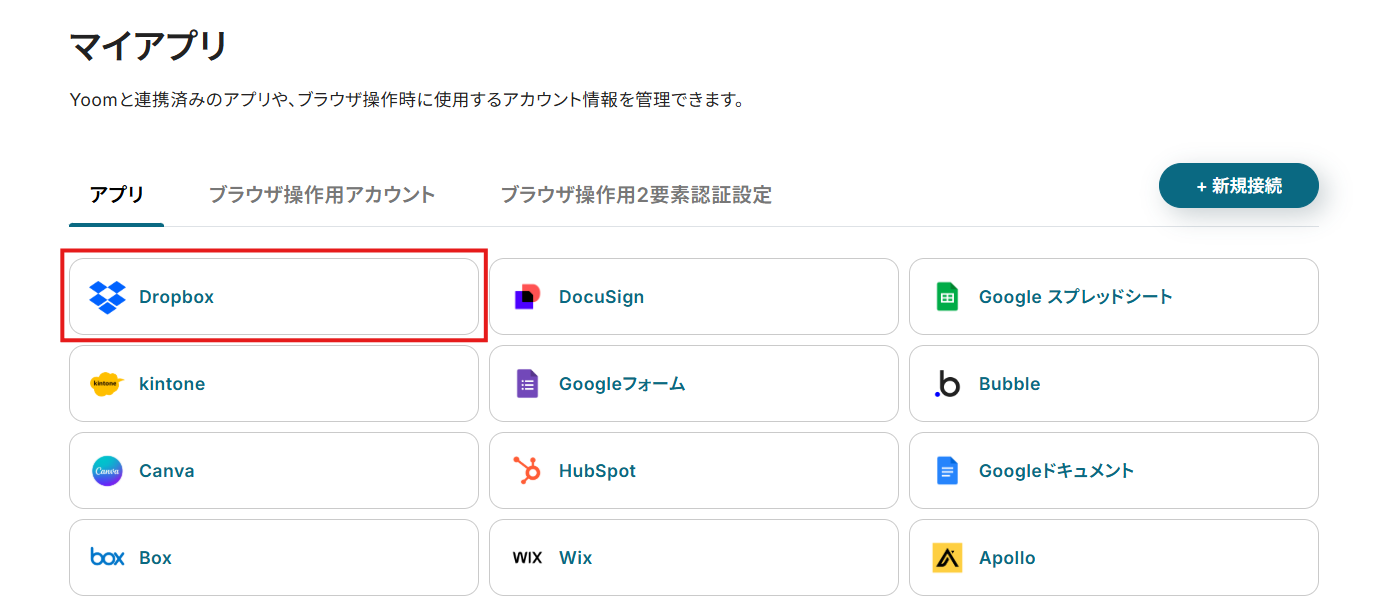 「マイアプリ」の画面に戻り、Dropboxが追加されていれば連携は完了です。