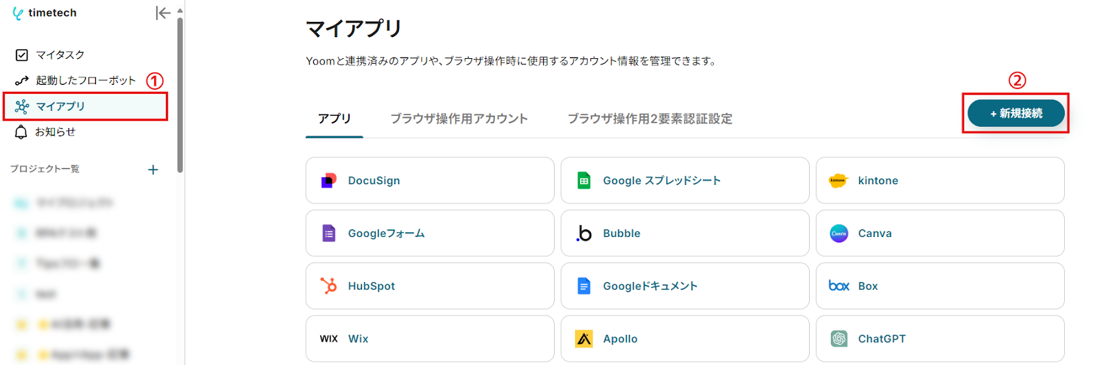 マイアプリ画面の右側にある「+新規接続」をクリック。