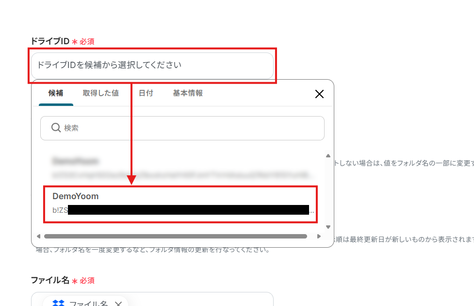 3.「ドライブID」にファイルをアップロードするドライブのIDを設定。 入力欄をクリックすると、連携しているOneDriveのドライブから候補が表示されますので、対象となるドライブを選択してください。