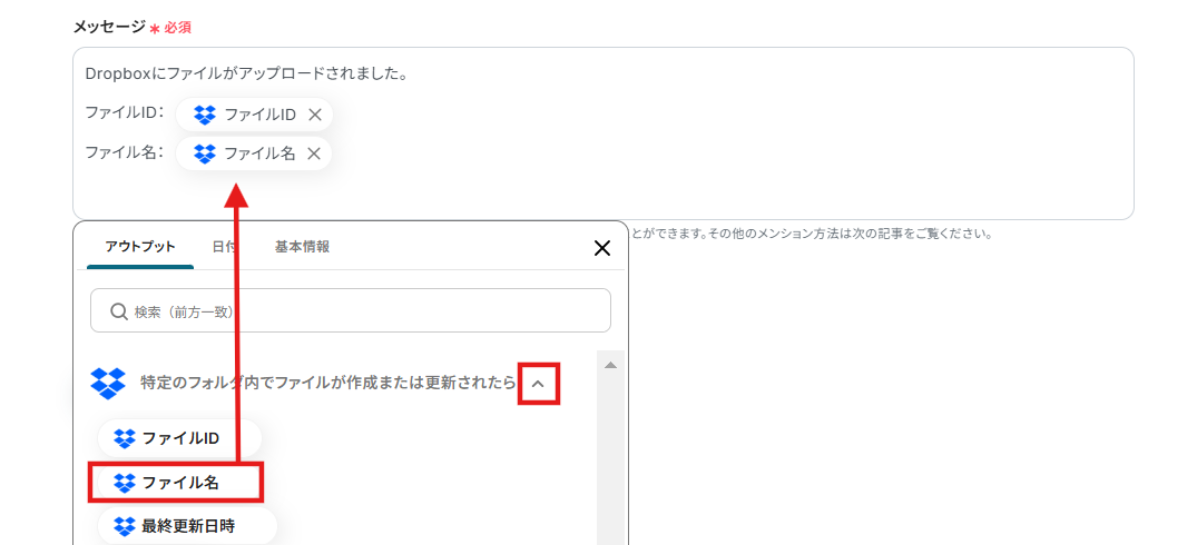 アウトプットを活用することで、Dropboxの情報を反映した内容がフロー起動ごとに変わります。