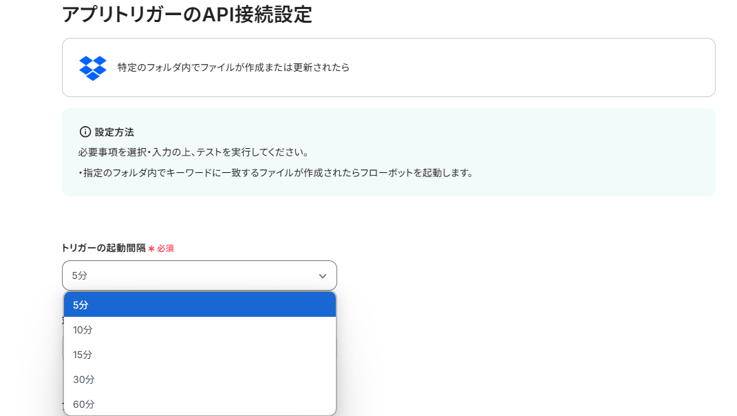 ・トリガーは5分、10分、15分、30分、60分の間隔で起動間隔を選択できます。