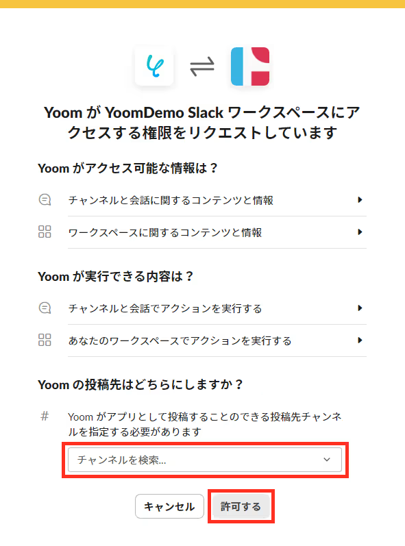 以下の画面が表示されるので、Dropboxと連携したいチャンネルをプルダウンから選択し、「許可する」を押しましょう。