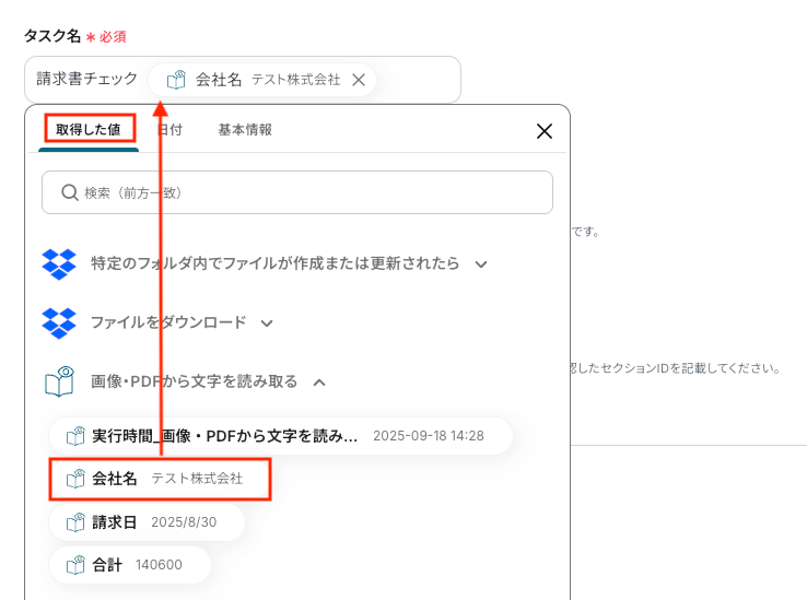 「タスク名」を取得した値から選択します。今回は会社名=タスク名としてみました。