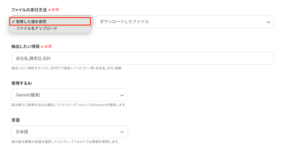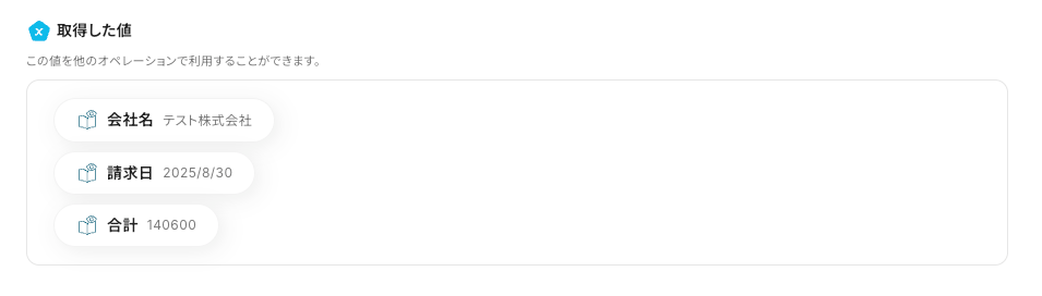 以下を参考に必要項目を設定しましょう。今回は請求書から会社名、請求日、合計を抽出するため、以下のように設定しました。