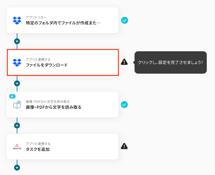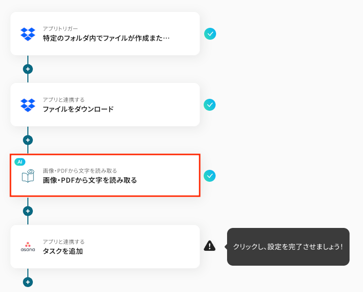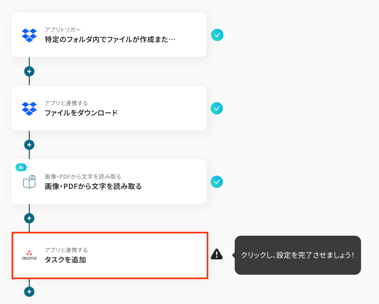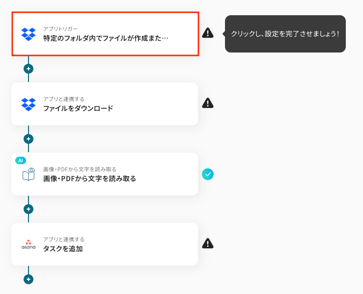 今回は「Dropboxに追加されたファイルをOCRし、Asanaにタスクを追加する」フローを作成していきます!作成の流れは大きく分けて以下のとおりです。
