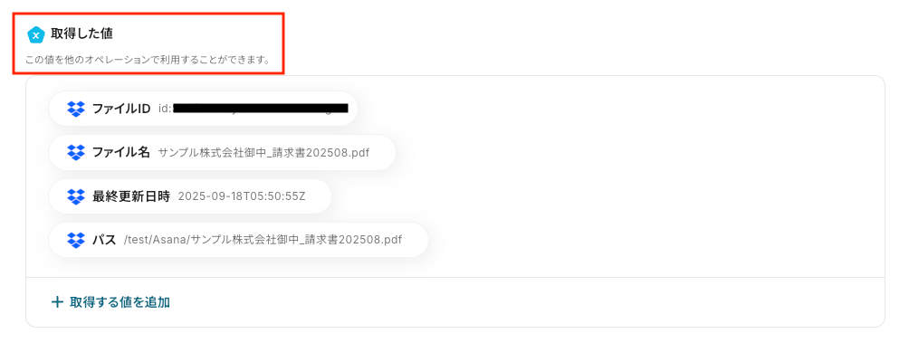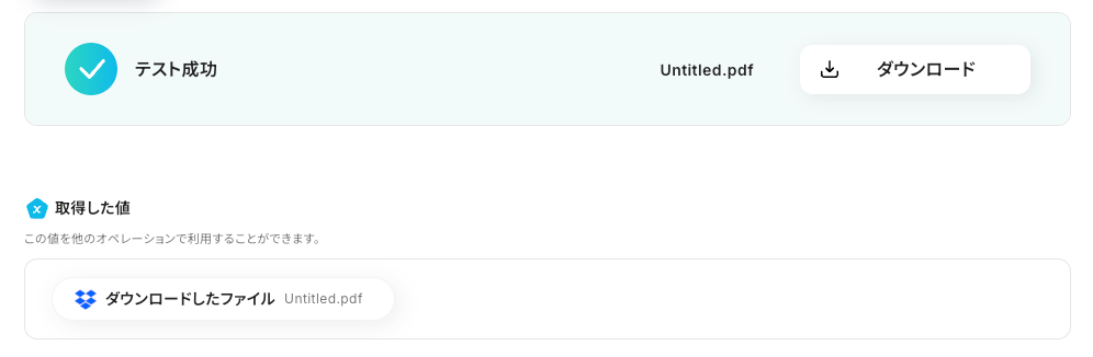 テストが成功すると以下のように「取得した値」が表示されます。「取得した値」は、後のフロー設定で使用するデータです。