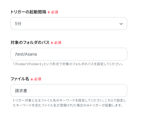 「トリガーの起動間隔」を確認し、「対象のフォルダのパス」「ファイル名」は手動で入力します。