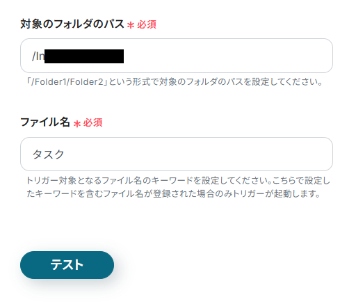 このとき、Dropboxのトリガー設定で「対象のフォルダのパス」に、プロジェクトフォルダのパスのみを設定してください。