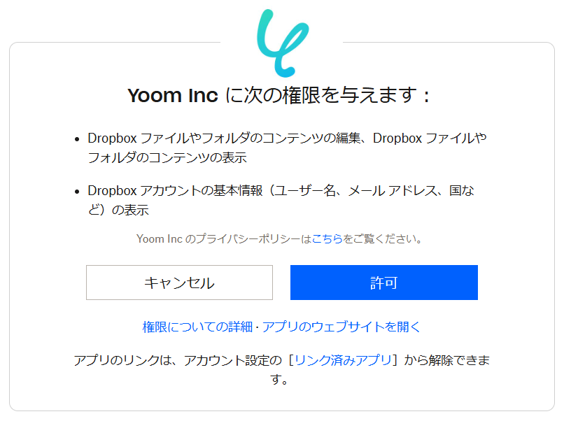ログイン後、Yoomに権限を与える画面が表示されるので、「許可」をクリックすると連携完了です。