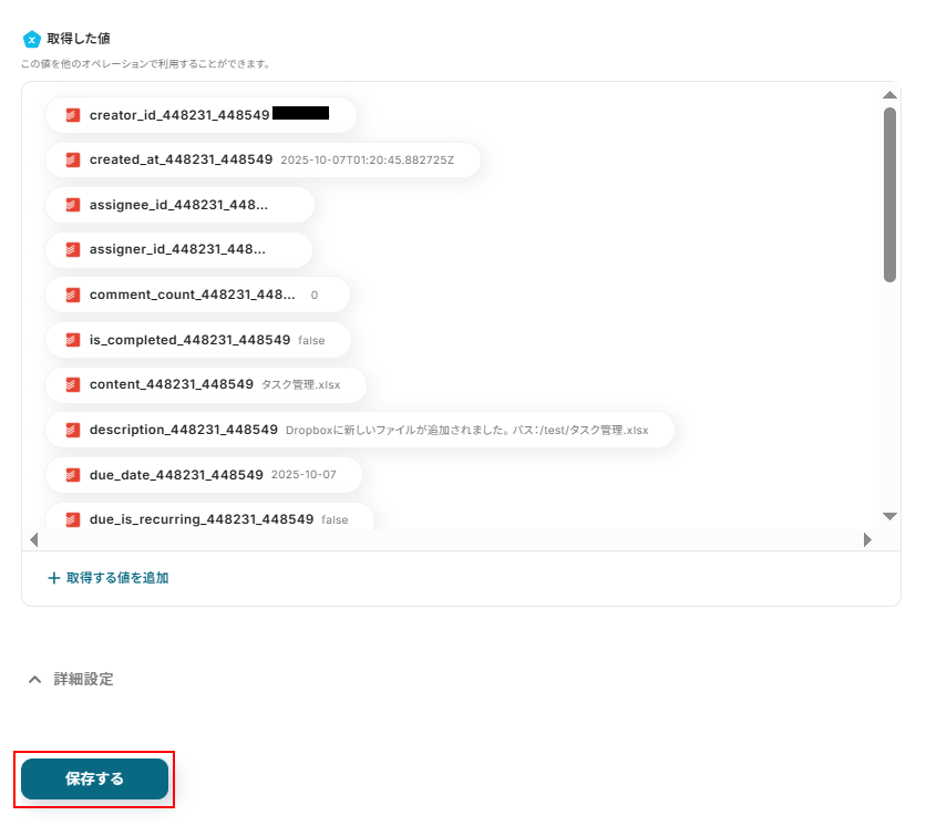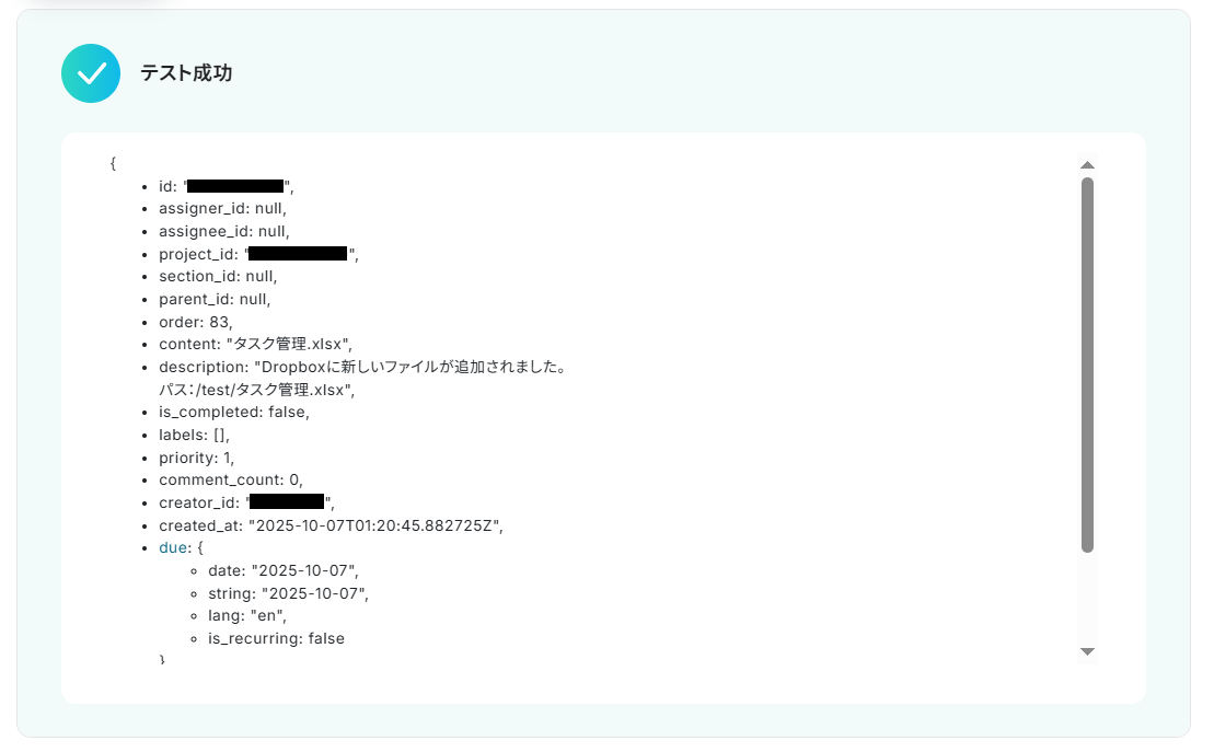 Dropboxのトリガー設定では、タスク作成のきっかけとしたいフォルダのパスを任意で設定してください。特定のファイル名のみを対象にすることも可能です。 Todoistでタスクを作成する際に、プロジェクトや担当者、期限日などを自由に設定できます。また、タスク名にDropboxのファイル名を含めるなど、動的な設定が可能です。 ■注意事項