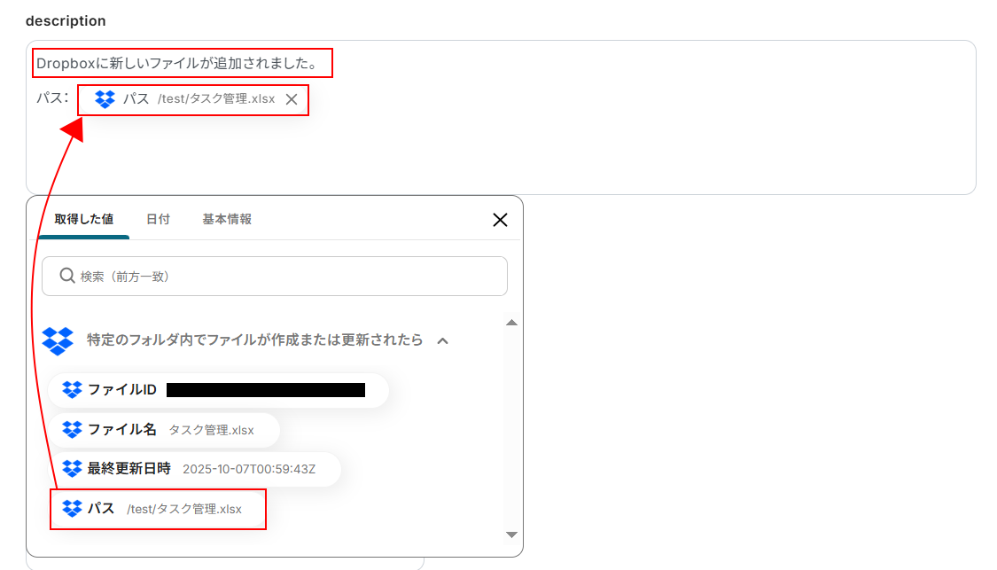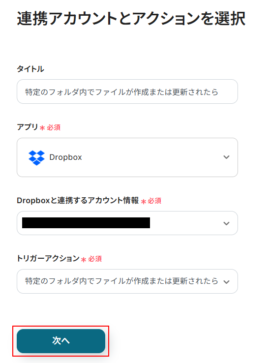 ステップ3:Dropboxの特定のフォルダ内でファイルが作成または更新された際の設定