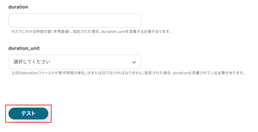 ここまで設定できたら「テスト」をクリックしましょう。 ※テストをクリックすると実際にタスクが作成されます。