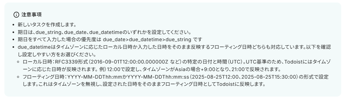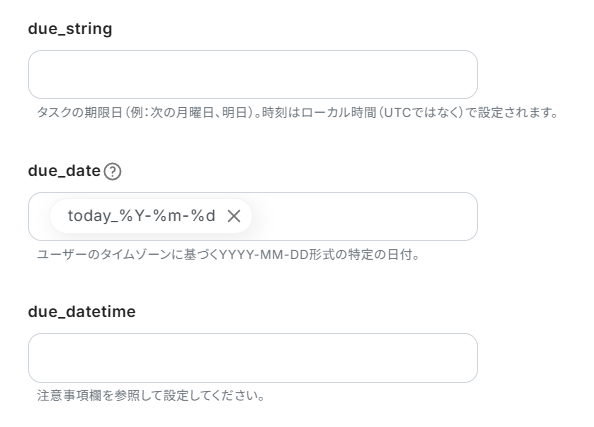 次に、ページ上部の注意事項にあるようにdue_string、due_date、due_datetimeのいずれかを設定します。