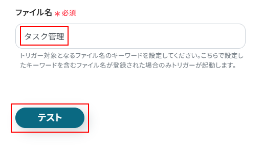 ファイル名を設定します。 先ほどアップロードしたファイルの名前から、キーワードとして使用したいワードを入力してください。 ここまで設定できたら「テスト」をクリックしましょう。