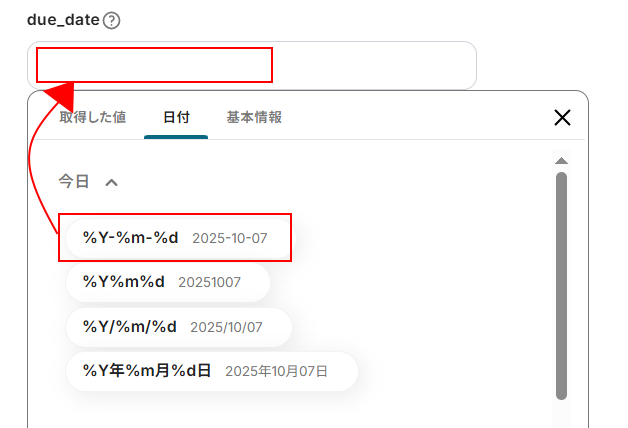 今回は、due_dateに今日の日付を設定しました。 今日の日付は入力欄をクリックし、取得した値の横の日付タブから選択可能です。 due_string、due_date、due_datetimeを設定する際は、注意事項と注釈を確認して設定してください。