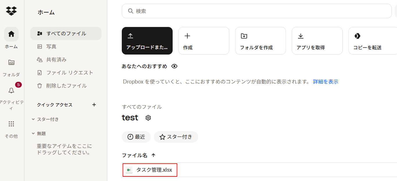 次に、ファイルをアップロードしましょう。 この後Yoomで連携テストを行います。その際、トリガーであるDropboxの特定のフォルダ内でファイルが作成または更新されたらという条件を満たす必要があるため、 任意のファイルを用意し、使用したいフォルダ内にアップロードしてください。 今回はtestフォルダに以下のようなファイルをアップロードしました。