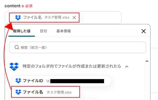 contentを設定します。 デフォルトでファイル名が設定されているため今回はそのまま使用しますが、変更したい場合は以下のように入力欄をクリックし取得した値から設定 してください。 取得した値を活用することで、固定値ではなく、トリガーが実行されるたびに最新の情報が反映できます。 ※不要な文字が入力されている場合は削除してください。