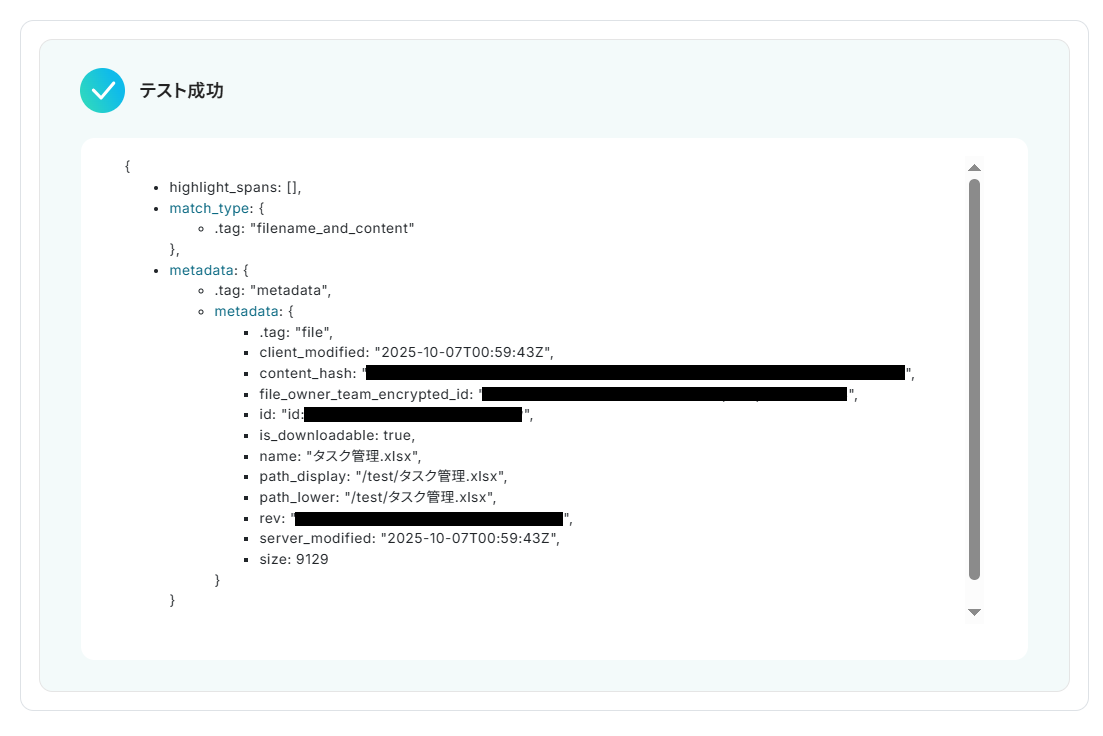 テストに成功するとテスト成功画面が表示され、取得した値が表示されます。取得した値はこのあとの設定でも使用します。 詳しく知りたい方は以下のリンク先をご覧ください。