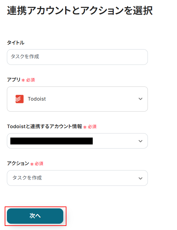タイトルは任意のものに変更可能ですが、変更がなければそのままでも問題ありません。 連携するアカウント情報にはステップ1で連携したアカウントか、連携時に使用していたYoomのアカウントが表示されます。 アカウントを確認して問題なければ「次へ」をクリックしてください。