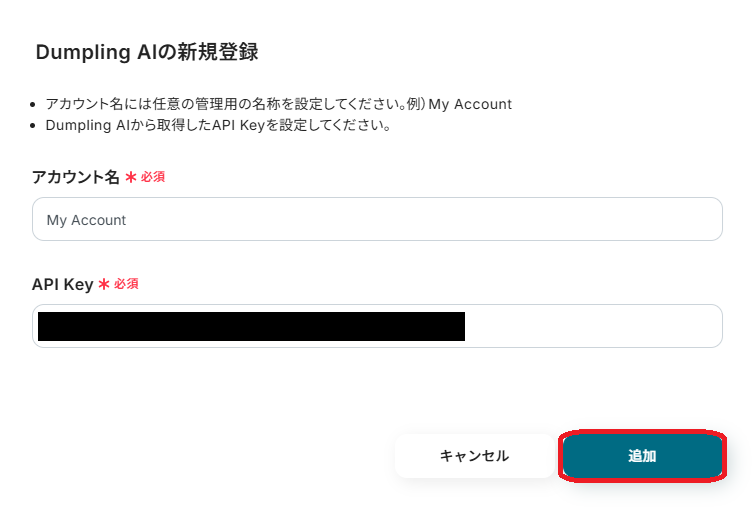 Yoomのマイアプリ連携ページからDumpling AIを選択し、事前にDumpling AIの管理画面から取得したAPIキーを入力するだけで、連携はすぐに完了します。