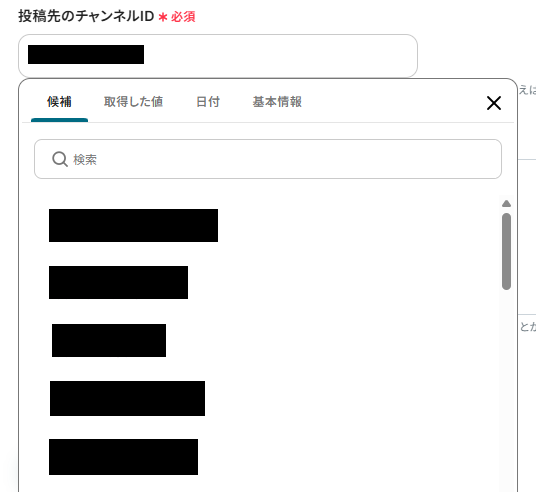 投稿先のチャンネルID:フレーム内をクリックして、投稿するSlackのチャンネルを選択します
