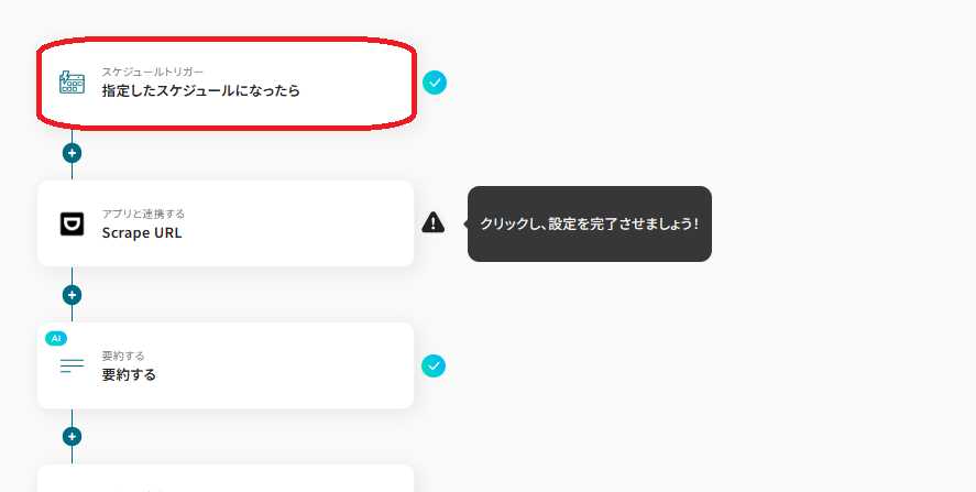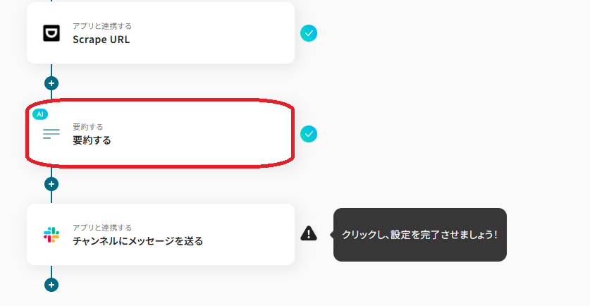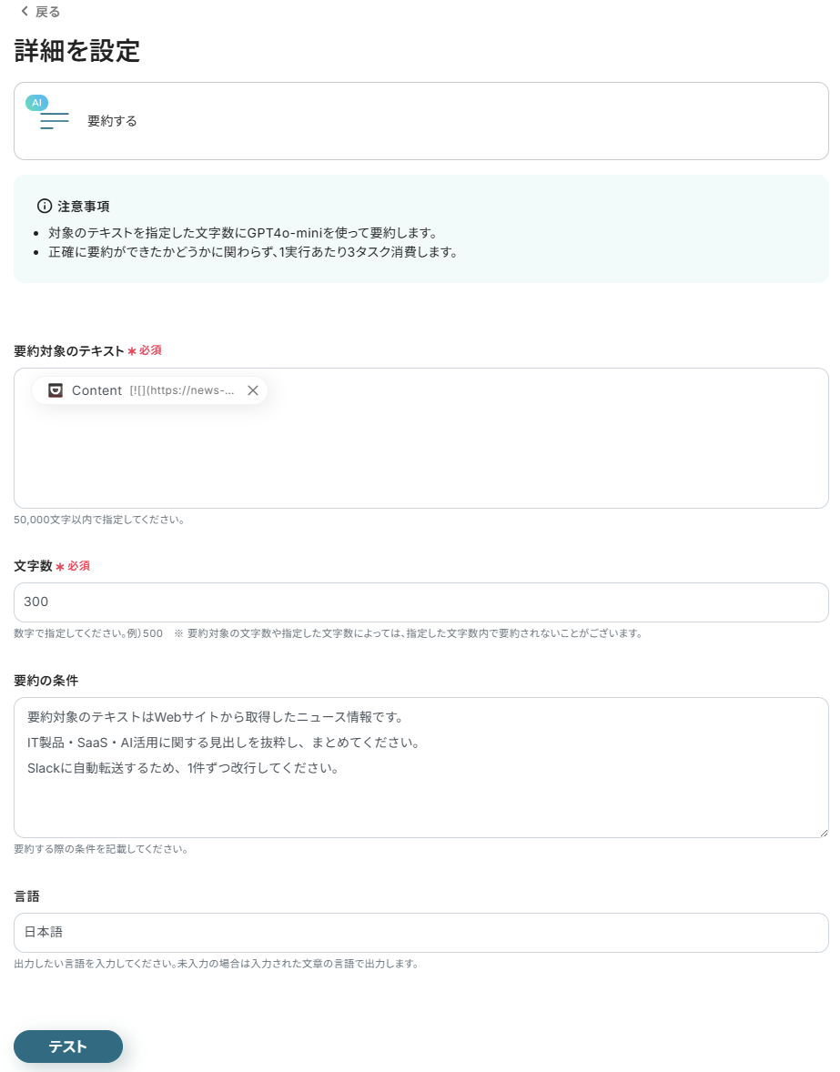 ここでは、定期的にWebニュースを取得し、要約する想定でyahooニュースサイトのURLを入力しました。