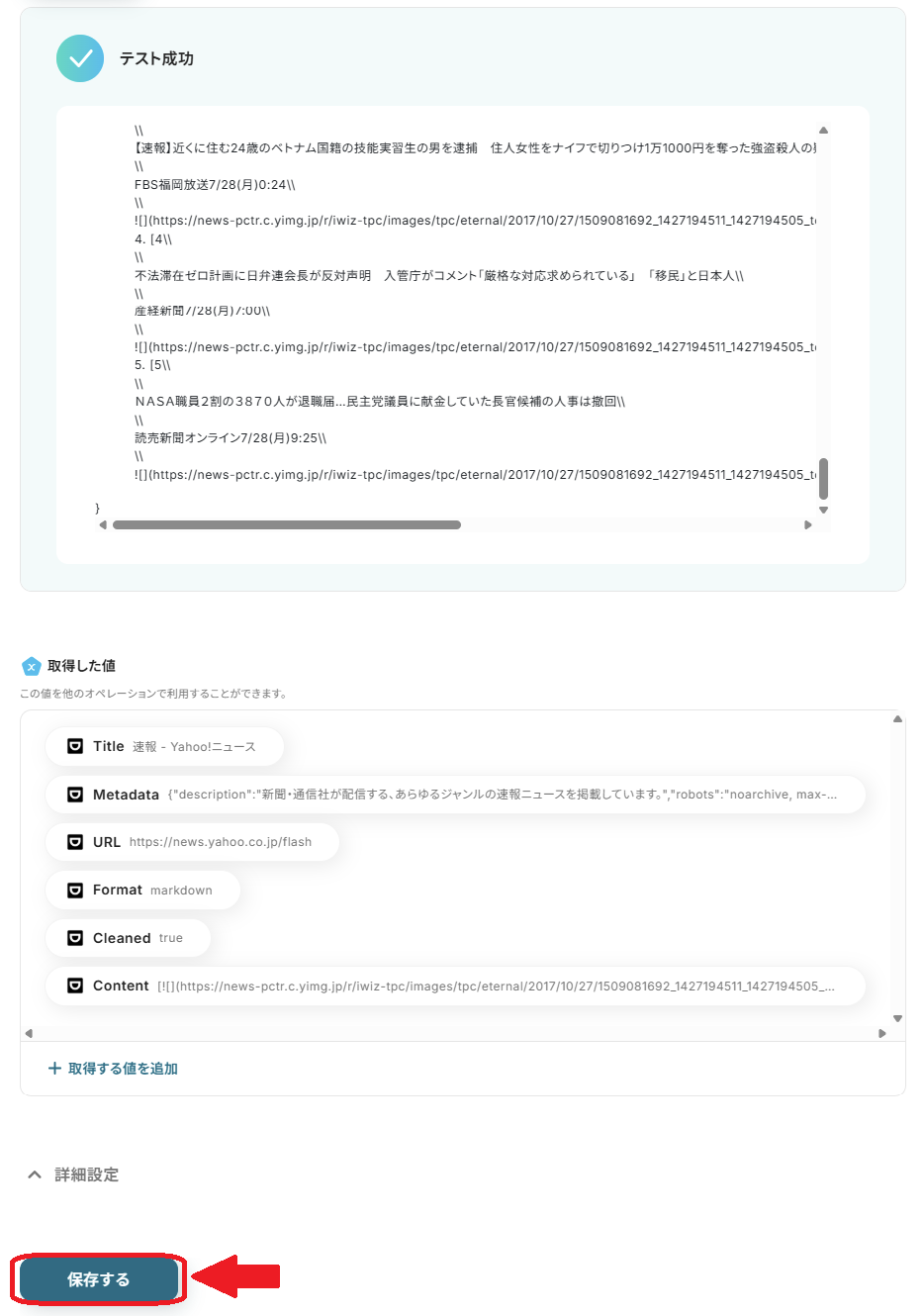 テストが成功したら、以下の画像のように「取得した値」に内容が表示されます。