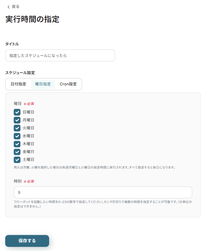 今回は、毎朝9:00にという設定をするため、曜日指定から以下の画像のように設定しています。