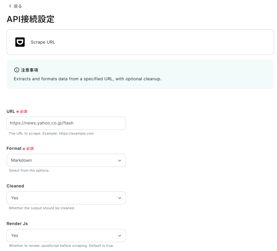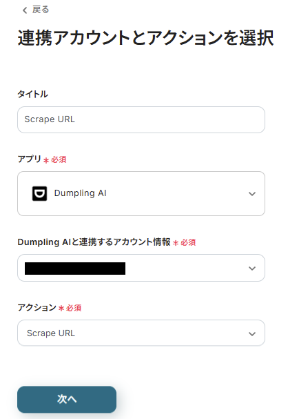 アクションが「Scrape URL」になっているか、確認して「次へ」をクリックします。